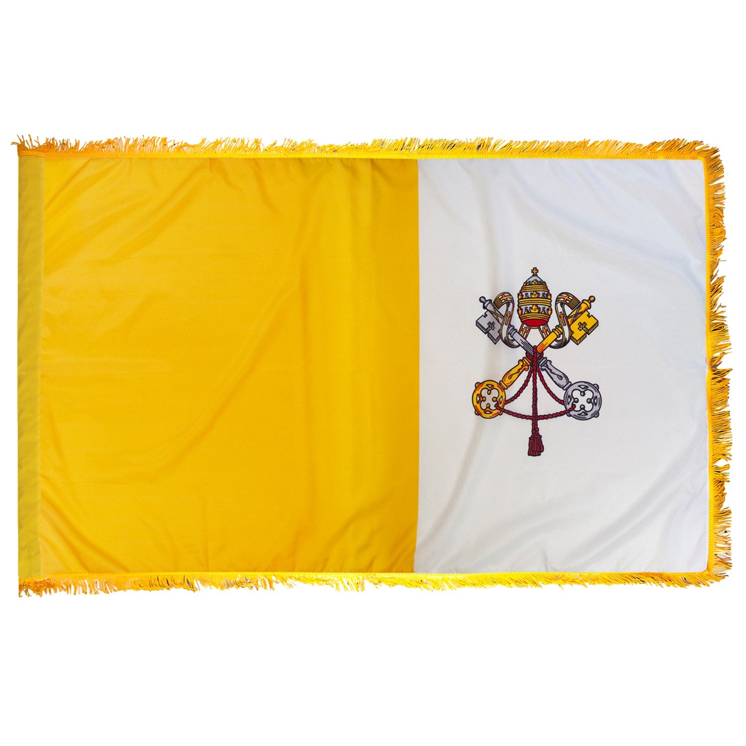 Indoor nylon pole-sleeve (pole hem) with optional gold fringe—ideal for ceremonies, lobbies, and offices. Not for outdoor use.